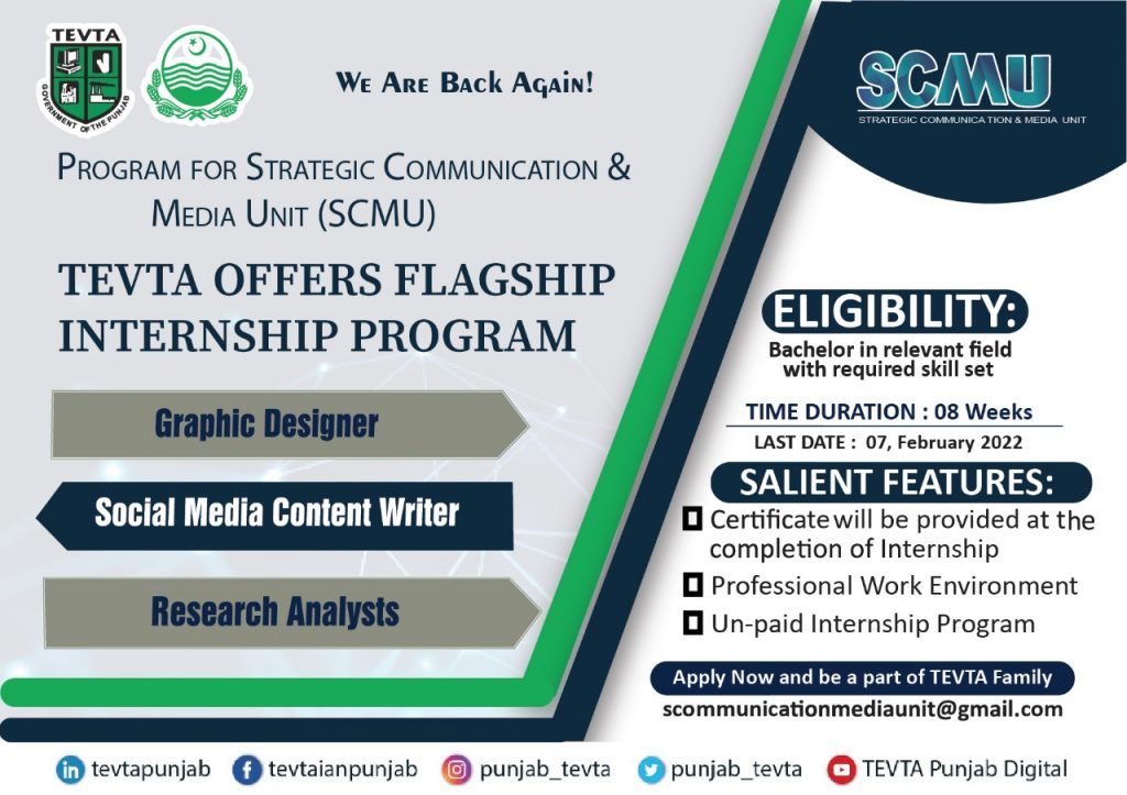 اسٹریٹجک کمیونیکیشن اینڈ میڈیا یونٹ (SCMU) کے تحت TEVTA انٹرنشپ پروگرام کے 6ویں بیچ کے لیے درخواستیں کھلی ہوئی ہیں۔