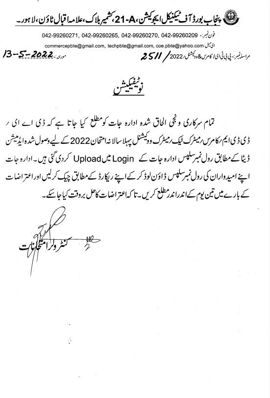 DAE roll number slips uploaded by PBTE