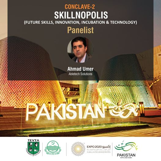 ٹاپ ٹیکنولوجسٹ احمد عمر، سی ای او ایبلٹیک سلوشنز TEVTA کے کنکلیو – 2 – Skillnopolis دبئی ایکسپو میں آج دوپہر 12 بجے (متحدہ عرب امارات کے معیاری وقت) میں شرکت کریں گے۔
