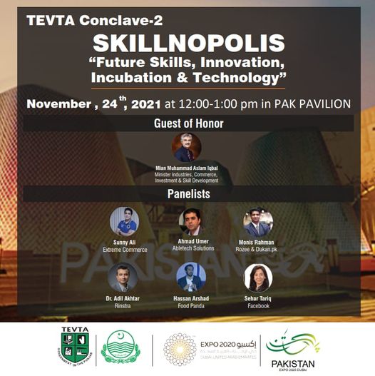 Skillnopolis – مستقبل کی ہنر، اختراع، انکیوبیشن اور ٹیکنالوجی 24 نومبر 2021 کو پاکستان پویلین، دبئی ایکسپو 2020 میں متحدہ عرب امارات کے معیاری وقت کے مطابق دوپہر 12 بجے
