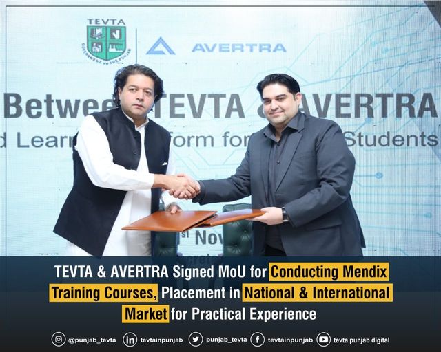 Chairperson TEVTA Mr. Ali Salman Signed MoU with Avertra to Create, Market & Conduct Mendix Training Courses, Placements of TEVTA Mendix Learners at National & International Market & to Provide Support for TEVTA Skill Commercialization