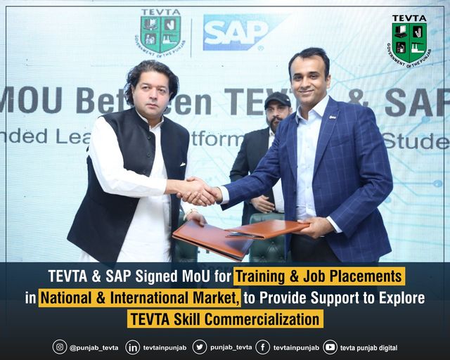 چیئرپرسن ٹیوٹا علی سلمان نے ٹیوٹا کے طلباء کو SAP لرننگ پلیٹ فارم اور قومی اور بین الاقوامی مارکیٹ میں ملازمت کی جگہیں فراہم کرنے کے لیے حارث فاضل، جنرل منیجر SAP کی موجودگی میں SAP کے ساتھ مفاہمت کی یادداشت پر دستخط کیے، تاکہ TEVTA سکل کمرشلائزیشن کے لیے تعاون فراہم کیا جا سکے۔