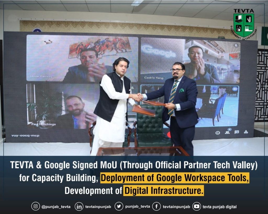 چیئرپرسن TEVTA جناب علی سلمان صدیق نے ٹیک ویلی پاکستان کے سی ای او اور بانی جناب عمر فاروق کے ساتھ صلاحیت سازی، گوگل ورک اسپیس ٹولز کی تعیناتی، ڈیجیٹل انفراسٹرکچر کی ترقی کے لیے مفاہمت کی یادداشت پر دستخط کیے ہیں۔ چیئرپرسن ٹیوٹا نے تعاون کو ڈیجیٹل پاکستان کے وژن کی طرف بڑھنے کا راستہ قرار دیا۔