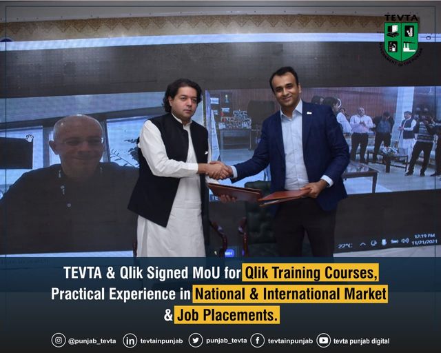 Chairperson TEVTA Ali Salman Siddique Signed MoU with Abdul Haseeb MD Telly Mark Consulting (Official Partner of Qlik) for Qlik Training Courses, Placement of Qlik Trainees in Local & Inl. Market for Practical Experience & Job Placements. Qlik will Provide access to its learning Content & Certification Materials.