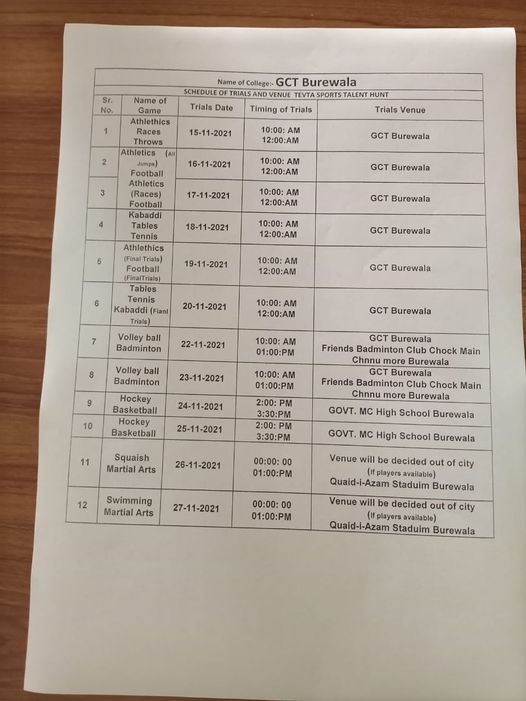 Trial Schedule of TEVTA Sports Talent Hunt Program 2021-22 GCT Burewala Leave a Comment / By admin / November 20, 2021 This schedule is specifically for GCT Burewala candidatesیہ شیڈول خاص طور پر جی سی ٹی بورے والا کے امیدواروں کے لیے ہے۔